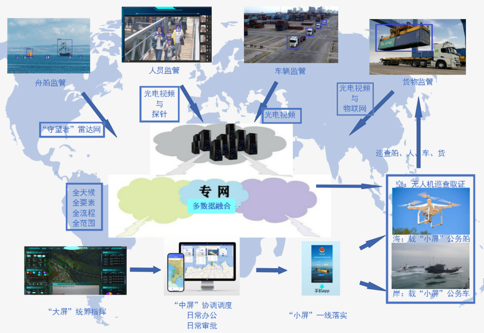 該系統(tǒng)能夠?qū)崿F(xiàn)對海岸港口船只、人、車等目標(biāo)實(shí)時監(jiān)測,通過物聯(lián)網(wǎng)對貨物形成港內(nèi)閉環(huán)監(jiān)管。將海港各類審批流、辦公系統(tǒng)充分融合,完成資源融合,集成“大屏幕”指揮統(tǒng)籌、“中屏幕”協(xié)調(diào)調(diào)度、“小屏幕”一線落實(shí)的“三屏”海港聯(lián)管體系,配合公務(wù)車船和無人機(jī)實(shí)地取證,“空海岸一體”對船、人、車、貨流動鏈條形成完整閉環(huán)巡查取證。