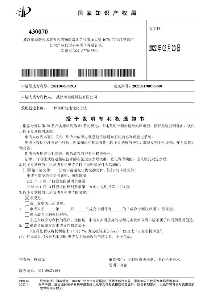 2022年2月23日,經(jīng)過國家知識產(chǎn)權局權威專家評審委員會的嚴格評審,海蘭信智能船SBU收到發(fā)明專利權通知書,專利名稱為“一種基于商船的航速優(yōu)化方案”,專利號為202110459659.3。