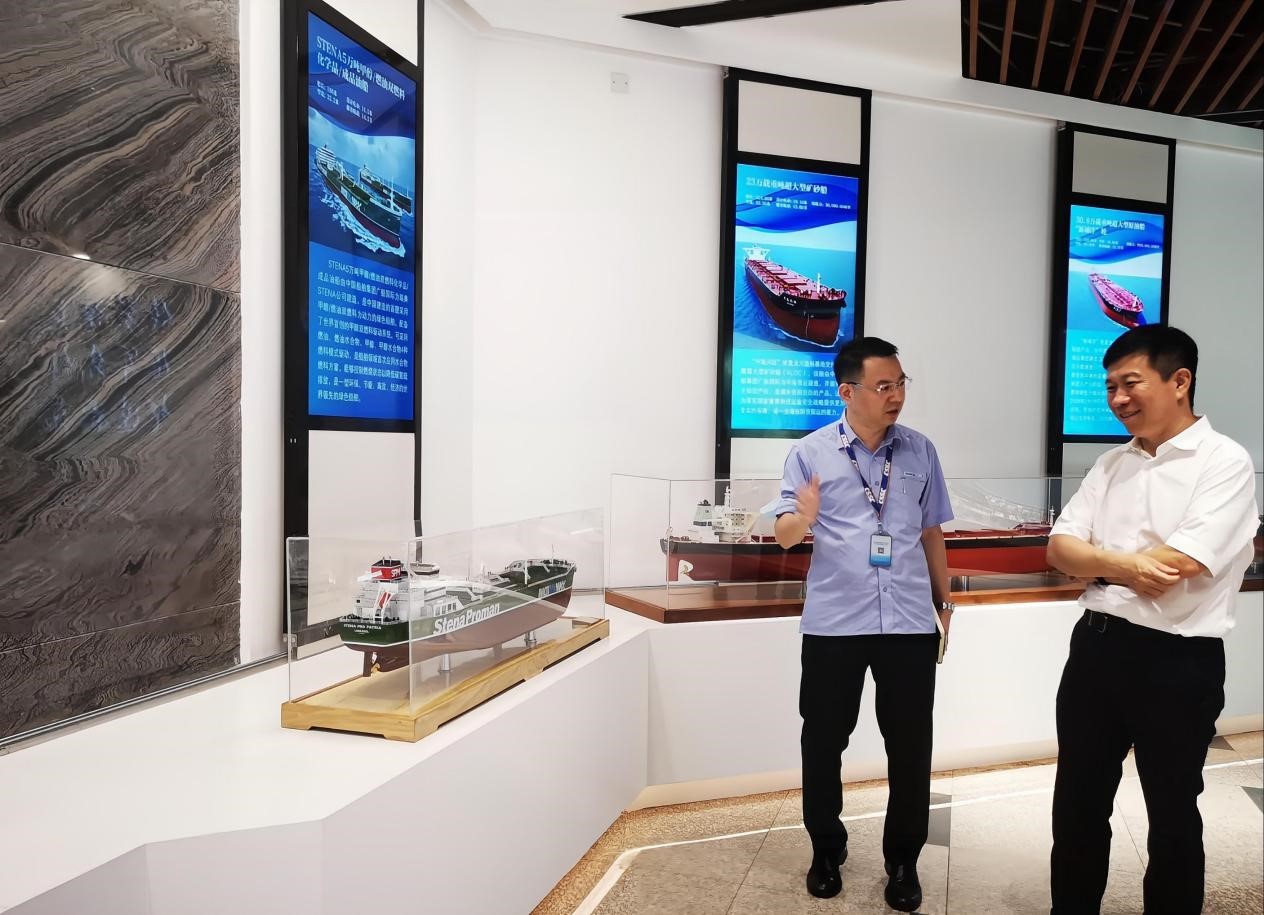 簽約座談會(huì)前,由廣船國際副總經(jīng)理周旭輝帶隊(duì)參觀公司展館并講解公司發(fā)展歷史。