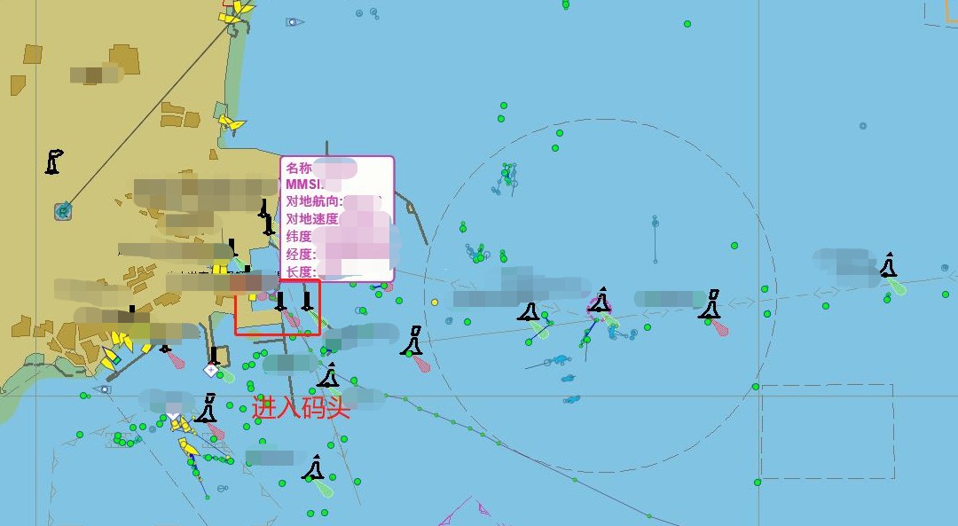 31分鐘之后值班人員報告:系統(tǒng)提示該船只已經(jīng)進(jìn)入碼頭。請岸上執(zhí)法力量予以配合,具體位置及船只名稱如圖所示。