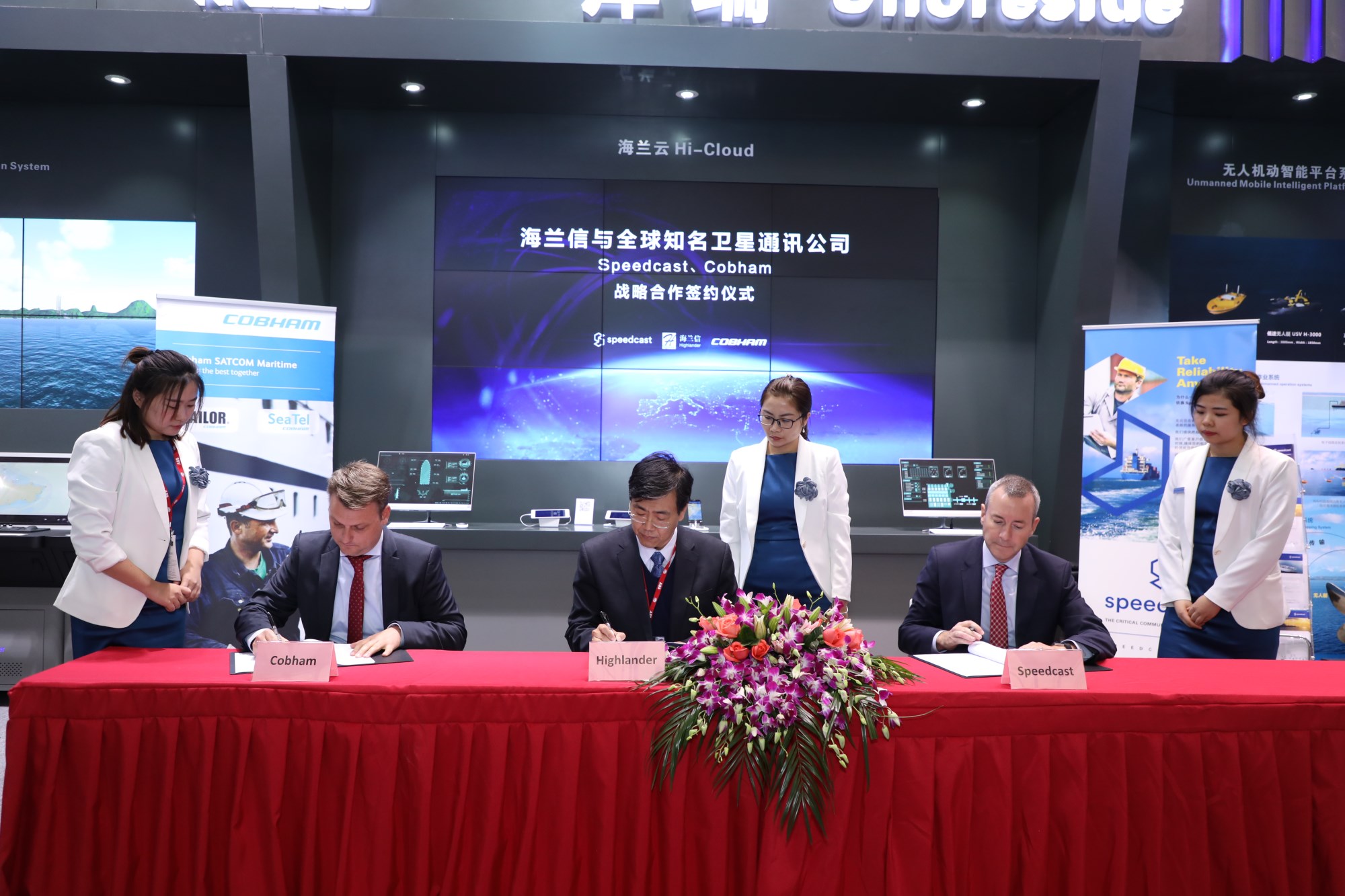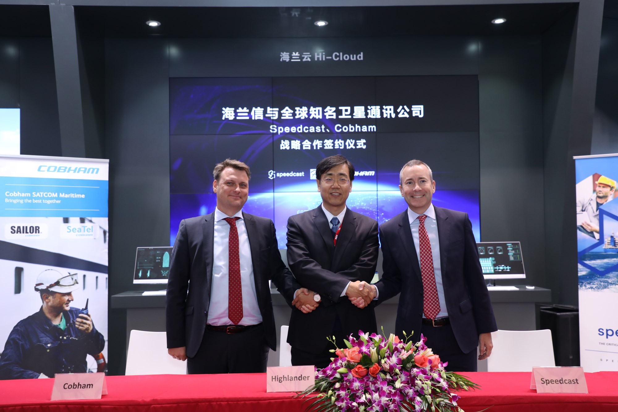12月5日,海蘭信在2017中國國際海事技術(shù)學(xué)術(shù)會議和展覽會上與全球第一大衛(wèi)星鏈路供應(yīng)商SpeedCast和全球衛(wèi)星通信領(lǐng)域首屈一指的硬件制造商Cobham 簽署戰(zhàn)略合作協(xié)議,三方將正式建立戰(zhàn)略合作伙伴關(guān)系。海蘭信創(chuàng)始人申萬秋、魏法軍,Cobham CEO Jensen Casper,Speedcast CEO Tim Bailey出席了本次簽約儀式。