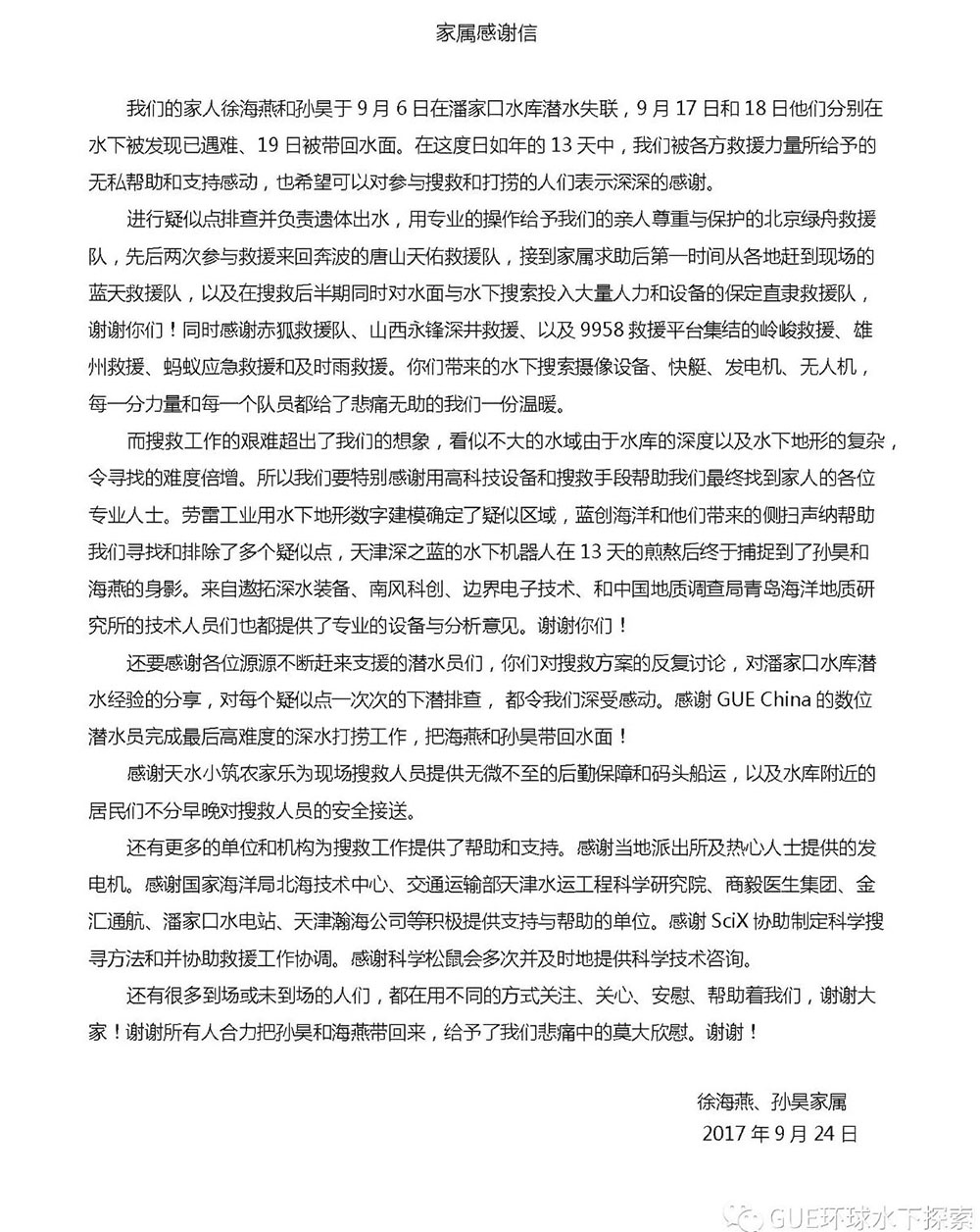 9月6日下午,在河北唐山潘家口水下長城探索項(xiàng)目中,兩名潛水愛好者徐海燕和孫昊結(jié)伴下潛,意外失蹤。GUE(全球水下探險家)聯(lián)合當(dāng)?shù)鼐脚c各方搜救力量立即展開搜尋工作,勞雷也快速集結(jié)力量全力參與到搜尋工作中。9月17日、18日,兩名潛水愛好者的遺體相繼被找到,19日中午和傍晚,兩名潛水員的遺體被相繼打撈出水。